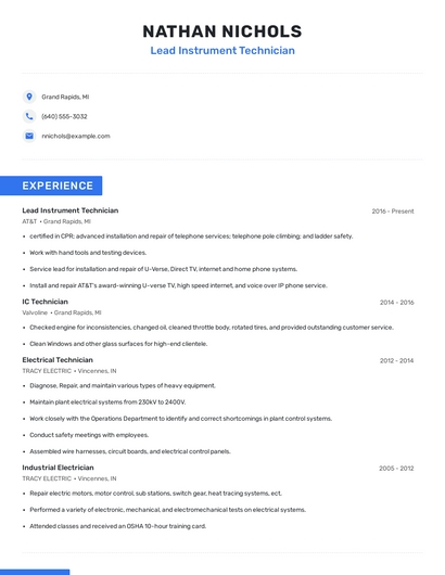 Build a professional lead instrument technician resume in minutes. Browse through our resume examples to identify the best way to word your resume. Then choose from 5+ resume templates to create your lead instrument technician resume.