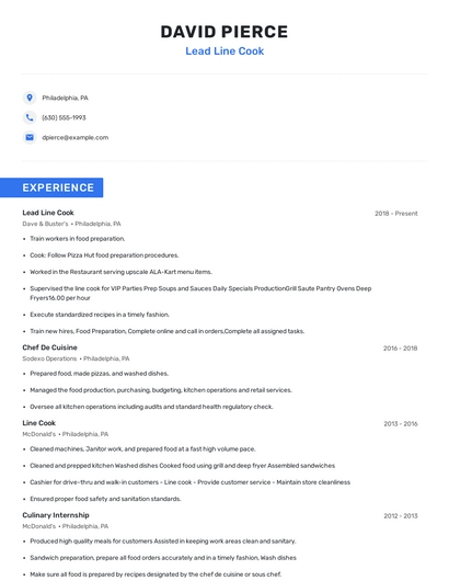 Build a professional lead line cook resume in minutes. Browse through our resume examples to identify the best way to word your resume. Then choose from 5+ resume templates to create your lead line cook resume.