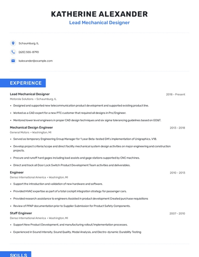 Build a professional lead mechanical designer resume in minutes. Browse through our resume examples to identify the best way to word your resume. Then choose from 5+ resume templates to create your lead mechanical designer resume.