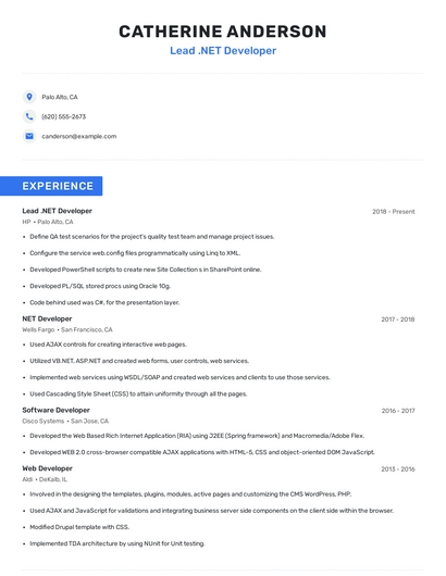 Build a professional lead .net developer resume in minutes. Our AI resume writing assistant will guide you through every step of the process, and you can choose from 10+ resume templates to create your lead .net developer resume.7. Architecture