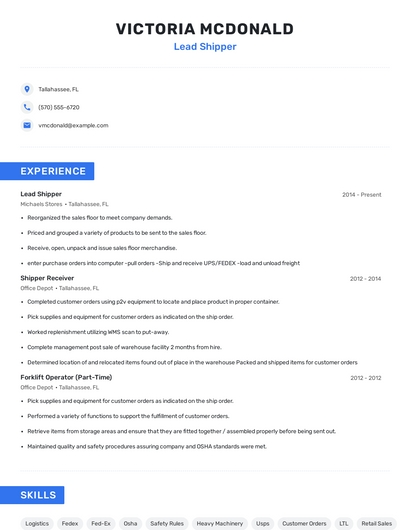 Build a professional lead shipper resume in minutes. Browse through our resume examples to identify the best way to word your resume. Then choose from 5+ resume templates to create your lead shipper resume.