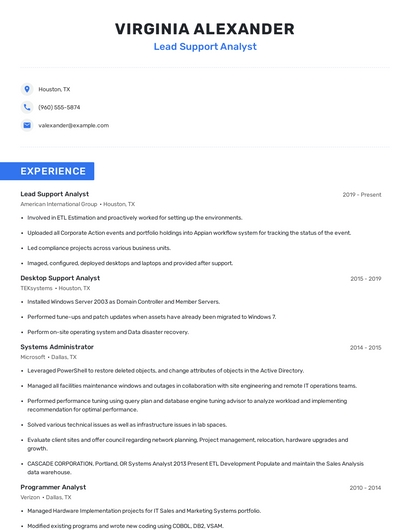 Build a professional lead support analyst resume in minutes. Browse through our resume examples to identify the best way to word your resume. Then choose from 5+ resume templates to create your lead support analyst resume.