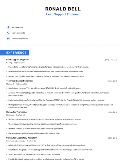 Build a professional lead support engineer resume in minutes. Browse through our resume examples to identify the best way to word your resume. Then choose from 5+ resume templates to create your lead support engineer resume.