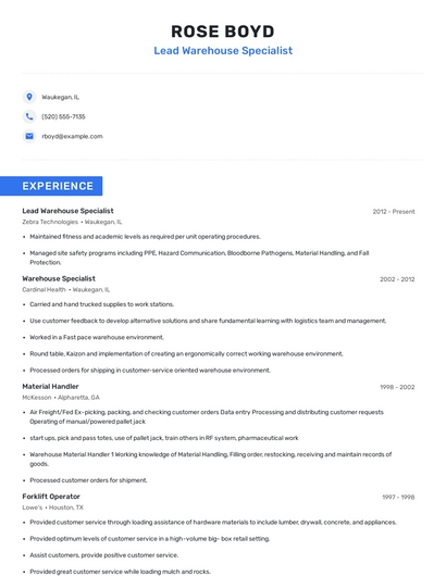 Build a professional lead warehouse specialist resume in minutes. Browse through our resume examples to identify the best way to word your resume. Then choose from 5+ resume templates to create your lead warehouse specialist resume.