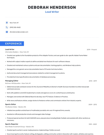 Build a professional lead writer resume in minutes. Browse through our resume examples to identify the best way to word your resume. Then choose from 5+ resume templates to create your lead writer resume.