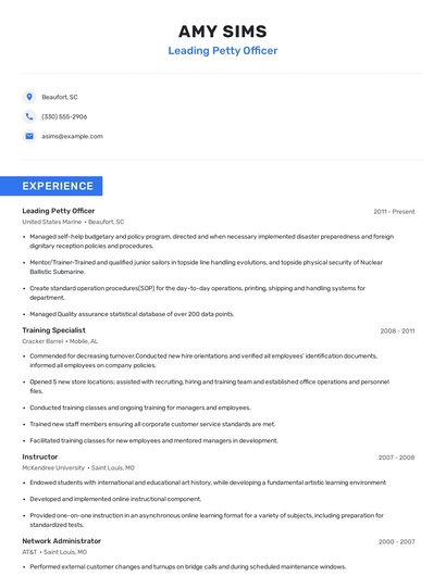 Build a professional leading petty officer resume in minutes. Browse through our resume examples to identify the best way to word your resume. Then choose from 5+ resume templates to create your leading petty officer resume.