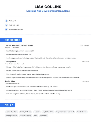 Build a professional learning and development consultant resume in minutes. Browse through our resume examples to identify the best way to word your resume. Then choose from 5+ resume templates to create your learning and development consultant resume.