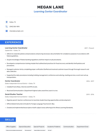 Build a professional learning center coordinator resume in minutes. Browse through our resume examples to identify the best way to word your resume. Then choose from 5+ resume templates to create your learning center coordinator resume.