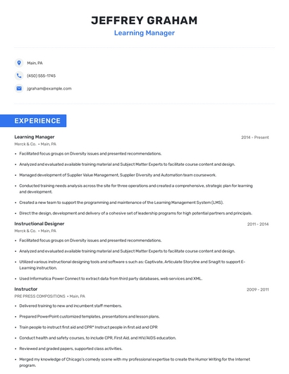 Build a professional learning manager resume in minutes. Browse through our resume examples to identify the best way to word your resume. Then choose from 5+ resume templates to create your learning manager resume.