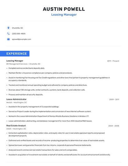 Build a professional leasing manager resume in minutes. Browse through our resume examples to identify the best way to word your resume. Then choose from 5+ resume templates to create your leasing manager resume.