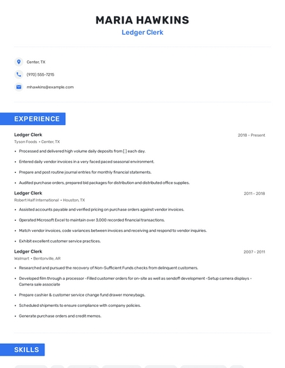 Build a professional ledger clerk resume in minutes. Our AI resume writing assistant will guide you through every step of the process, and you can choose from 10+ resume templates to create your ledger clerk resume.7. Expense Reports