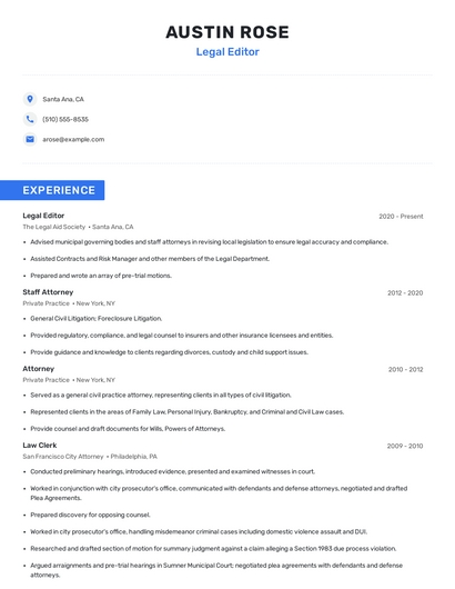 Build a professional legal editor resume in minutes. Browse through our resume examples to identify the best way to word your resume. Then choose from 5+ resume templates to create your legal editor resume.
