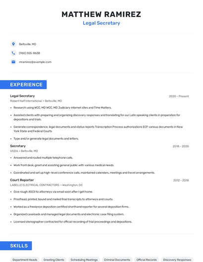 Build a professional legal secretary resume in minutes. Browse through our resume examples to identify the best way to word your resume. Then choose from 5+ resume templates to create your legal secretary resume.