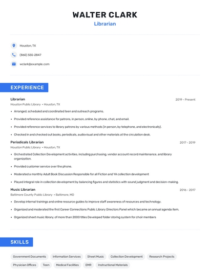 Build a professional librarian resume in minutes. Browse through our resume examples to identify the best way to word your resume. Then choose from 5+ resume templates to create your librarian resume.