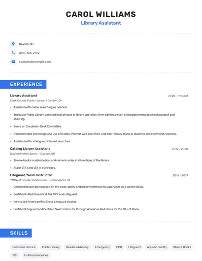 Build a professional library assistant resume in minutes. Browse through our resume examples to identify the best way to word your resume. Then choose from 5+ resume templates to create your library assistant resume.