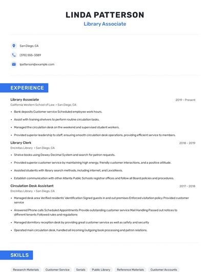 Build a professional library associate resume in minutes. Browse through our resume examples to identify the best way to word your resume. Then choose from 5+ resume templates to create your library associate resume.