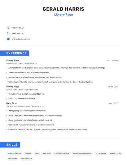 Build a professional library page resume in minutes. Browse through our resume examples to identify the best way to word your resume. Then choose from 5+ resume templates to create your library page resume.