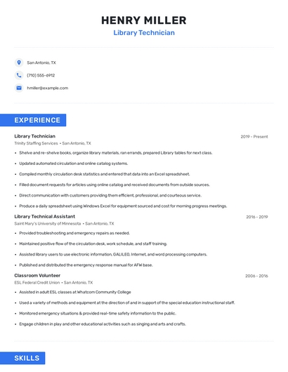 Build a professional library technician resume in minutes. Browse through our resume examples to identify the best way to word your resume. Then choose from 5+ resume templates to create your library technician resume.