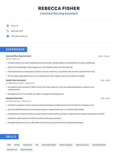 Build a professional licensed nursing assistant resume in minutes. Browse through our resume examples to identify the best way to word your resume. Then choose from 5+ resume templates to create your licensed nursing assistant resume.