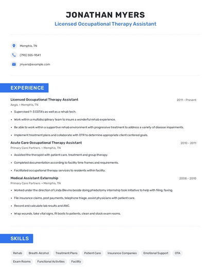 Build a professional licensed occupational therapy assistant resume in minutes. Browse through our resume examples to identify the best way to word your resume. Then choose from 5+ resume templates to create your licensed occupational therapy assistant resume.