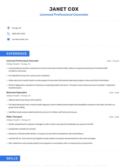 Build a professional licensed professional counselor resume in minutes. Browse through our resume examples to identify the best way to word your resume. Then choose from 5+ resume templates to create your licensed professional counselor resume.