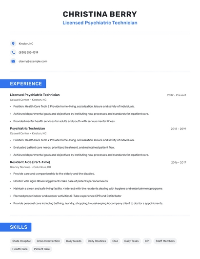 Build a professional licensed psychiatric technician resume in minutes. Browse through our resume examples to identify the best way to word your resume. Then choose from 5+ resume templates to create your licensed psychiatric technician resume.