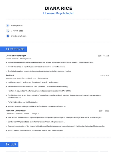 Build a professional licensed psychologist resume in minutes. Browse through our resume examples to identify the best way to word your resume. Then choose from 5+ resume templates to create your licensed psychologist resume.