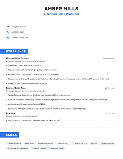 Build a professional licensed sales producer resume in minutes. Browse through our resume examples to identify the best way to word your resume. Then choose from 5+ resume templates to create your licensed sales producer resume.