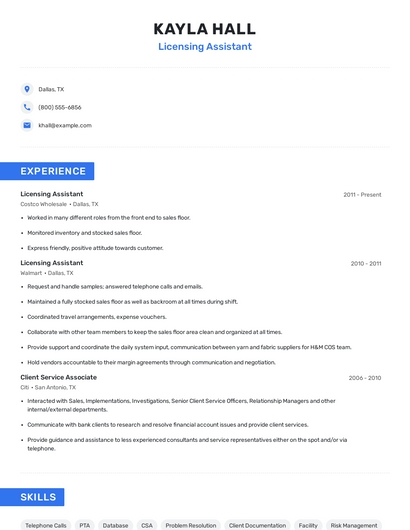 Build a professional licensing assistant resume in minutes. Browse through our resume examples to identify the best way to word your resume. Then choose from 5+ resume templates to create your licensing assistant resume.