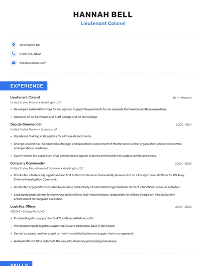 Build a professional lieutenant colonel resume in minutes. Browse through our resume examples to identify the best way to word your resume. Then choose from 5+ resume templates to create your lieutenant colonel resume.