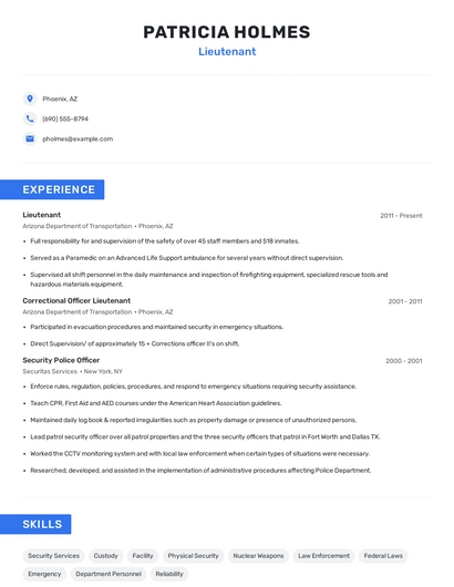 Build a professional lieutenant resume in minutes. Browse through our resume examples to identify the best way to word your resume. Then choose from 5+ resume templates to create your lieutenant resume.