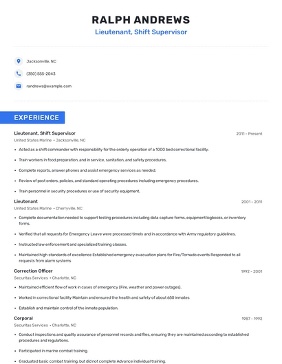 Build a professional lieutenant, shift supervisor resume in minutes. Browse through our resume examples to identify the best way to word your resume. Then choose from 5+ resume templates to create your lieutenant, shift supervisor resume.