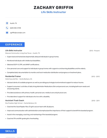 Build a professional life skills instructor resume in minutes. Browse through our resume examples to identify the best way to word your resume. Then choose from 5+ resume templates to create your life skills instructor resume.