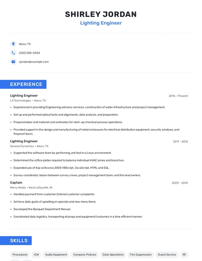 Build a professional lighting engineer resume in minutes. Browse through our resume examples to identify the best way to word your resume. Then choose from 5+ resume templates to create your lighting engineer resume.
