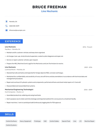 Build a professional line mechanic resume in minutes. Browse through our resume examples to identify the best way to word your resume. Then choose from 5+ resume templates to create your line mechanic resume.