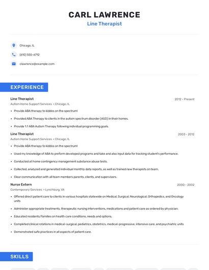 Build a professional line therapist resume in minutes. Browse through our resume examples to identify the best way to word your resume. Then choose from 5+ resume templates to create your line therapist resume.