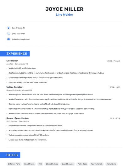 Build a professional line welder resume in minutes. Browse through our resume examples to identify the best way to word your resume. Then choose from 5+ resume templates to create your line welder resume.