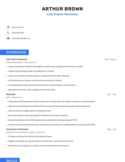 Choose from 10+ customizable link trainer mechanic resume templates