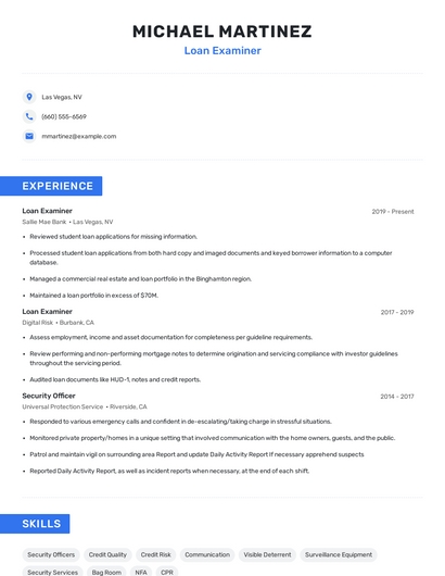 Build a professional loan examiner resume in minutes. Our AI resume writing assistant will guide you through every step of the process, and you can choose from 10+ resume templates to create your loan examiner resume.What skills help Loan Examiners find jobs?