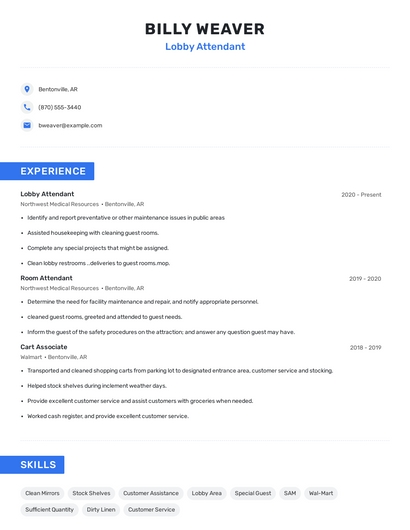 Build a professional lobby attendant resume in minutes. Our AI resume writing assistant will guide you through every step of the process, and you can choose from 10+ resume templates to create your lobby attendant resume.7. Clean Rooms