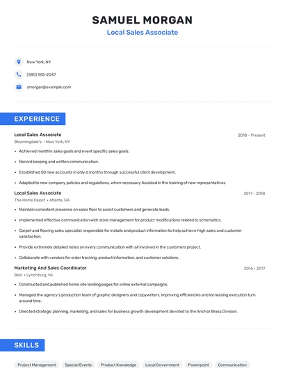 Build a professional local sales associate resume in minutes. Our AI resume writing assistant will guide you through every step of the process, and you can choose from 10+ resume templates to create your local sales associate resume.What skills help Local Sales Associates find jobs?