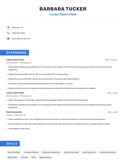 The most important skills for a locker room clerk resume and required skills for a locker room clerk to have include: