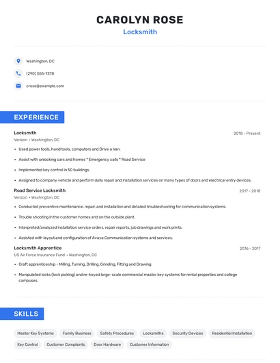 Build a professional locksmith resume in minutes. Browse through our resume examples to identify the best way to word your resume. Then choose from 5+ resume templates to create your locksmith resume.