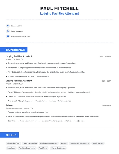 Build a professional lodging facilities attendant resume in minutes. Browse through our resume examples to identify the best way to word your resume. Then choose from 5+ resume templates to create your lodging facilities attendant resume.