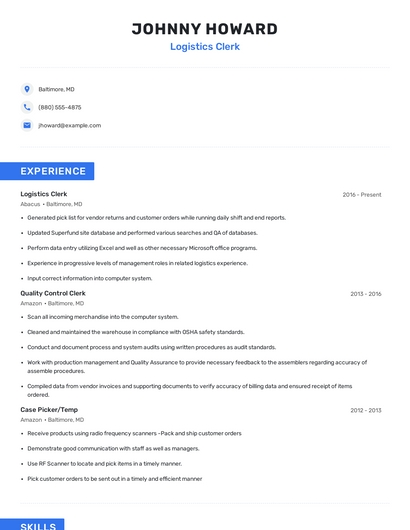 Build a professional logistics clerk resume in minutes. Browse through our resume examples to identify the best way to word your resume. Then choose from 5+ resume templates to create your logistics clerk resume.