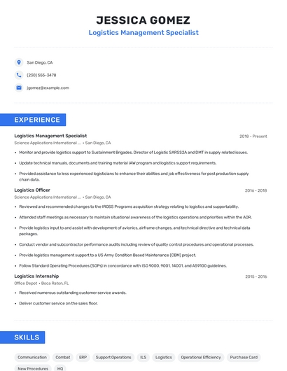 Build a professional logistics management specialist resume in minutes. Browse through our resume examples to identify the best way to word your resume. Then choose from 5+ resume templates to create your logistics management specialist resume.