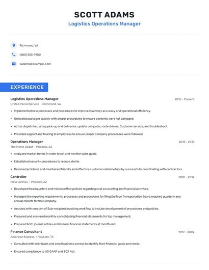 Build a professional logistics operations manager resume in minutes. Browse through our resume examples to identify the best way to word your resume. Then choose from 5+ resume templates to create your logistics operations manager resume.