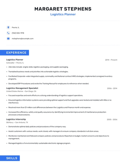 Build a professional logistics planner resume in minutes. Browse through our resume examples to identify the best way to word your resume. Then choose from 5+ resume templates to create your logistics planner resume.