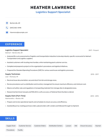 Build a professional logistics support specialist resume in minutes. Browse through our resume examples to identify the best way to word your resume. Then choose from 5+ resume templates to create your logistics support specialist resume.