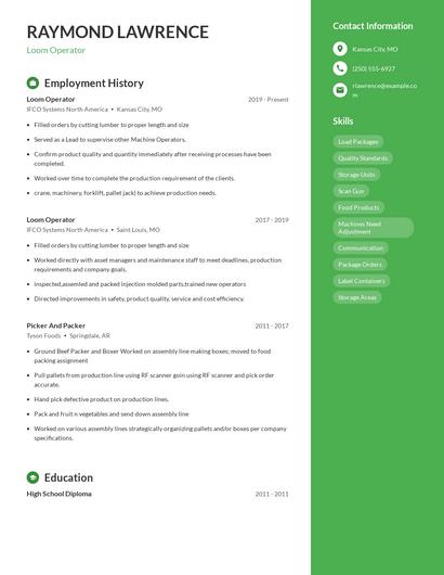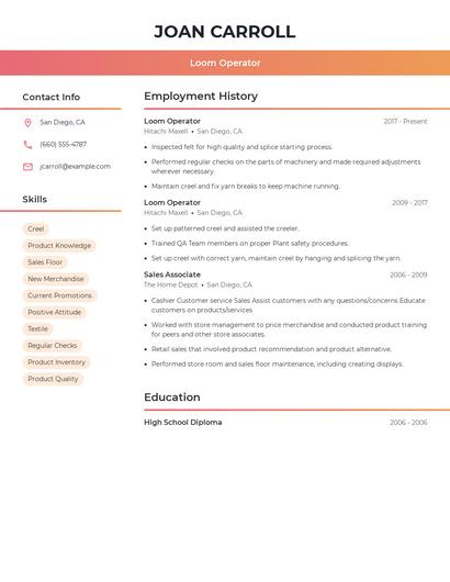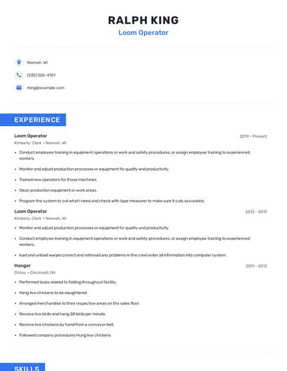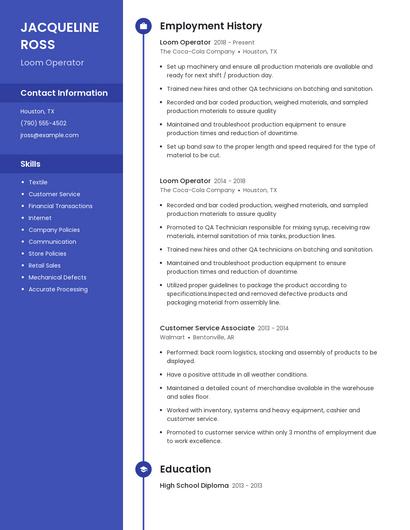 You can use Zippia's AI resume builder to make the resume writing process easier while also making sure that you include key information that hiring managers expect to see on a loom operator resume. You'll find resume tips and examples of skills, responsibilities, and summaries, all provided by Zippi, your career sidekick.